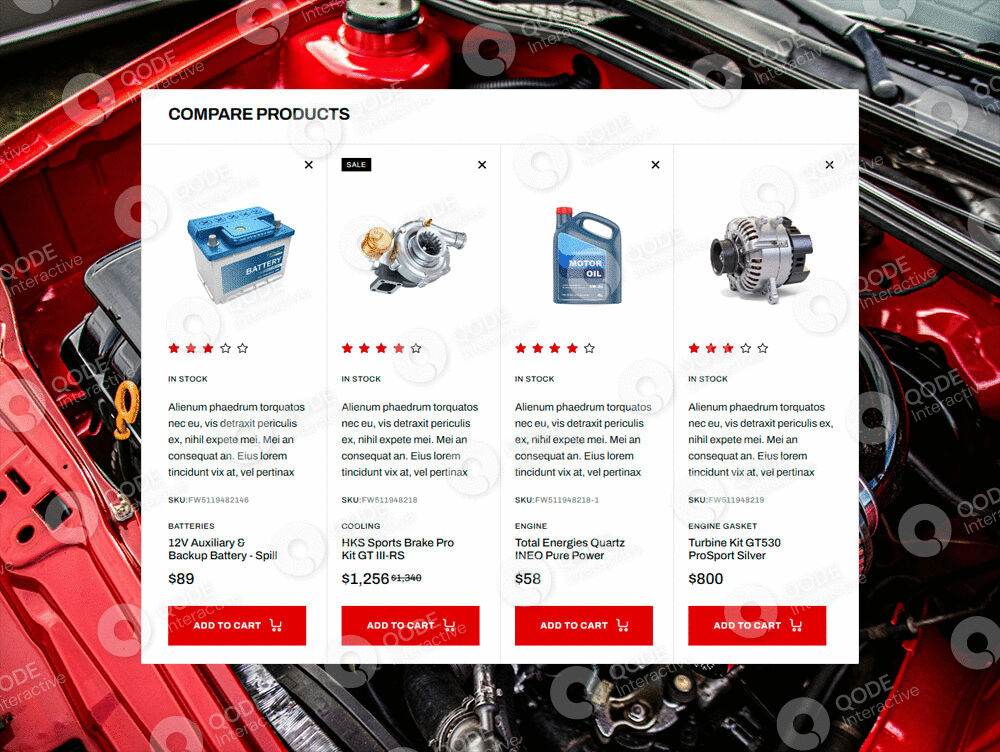 The theme is fully compatible with the QODE Compare plugin, allowing for neat side-by-side product comparisons in tables.